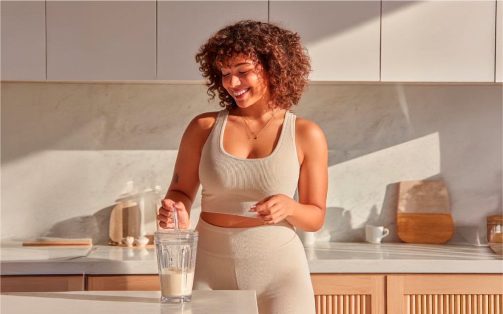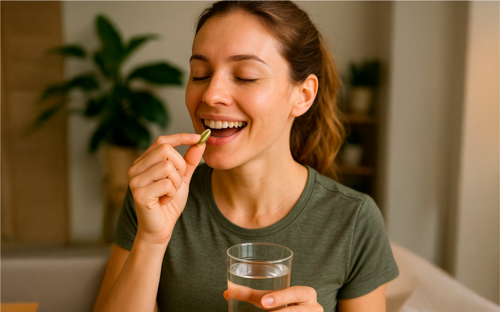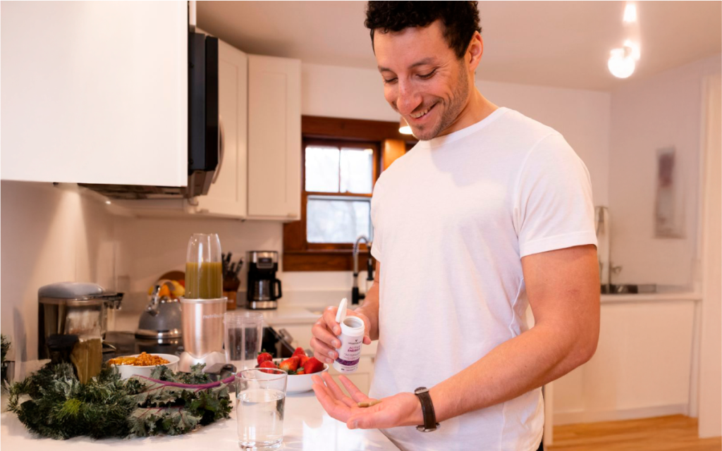- Fotos de contexto de la persona tomando suplementos, por ejemplo, en su cocina.