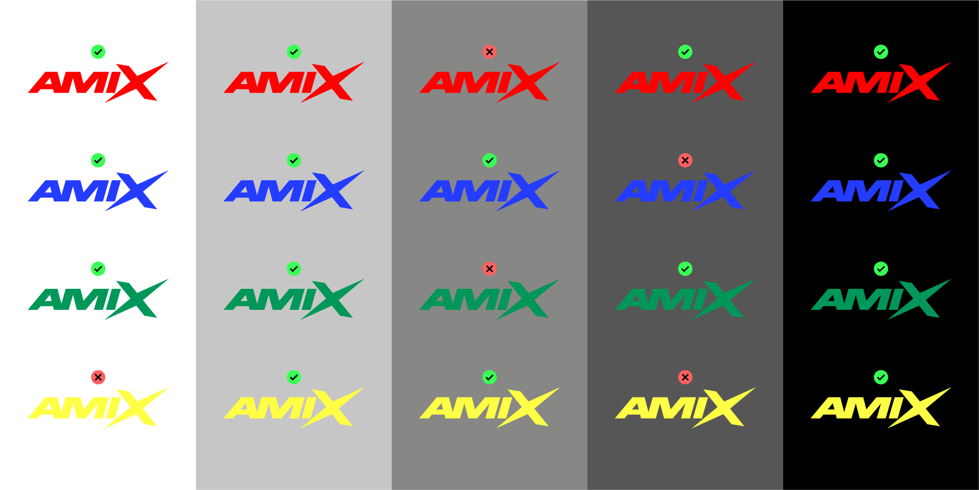A la hora de utilizar el logotipo de AMIX en cualquiera de sus versiones, se debe partir de los archivos proporcionados arriba y no alterar en ningún caso el diseño original. A continuación se muestran varios ejemplos de usos incorrectos.